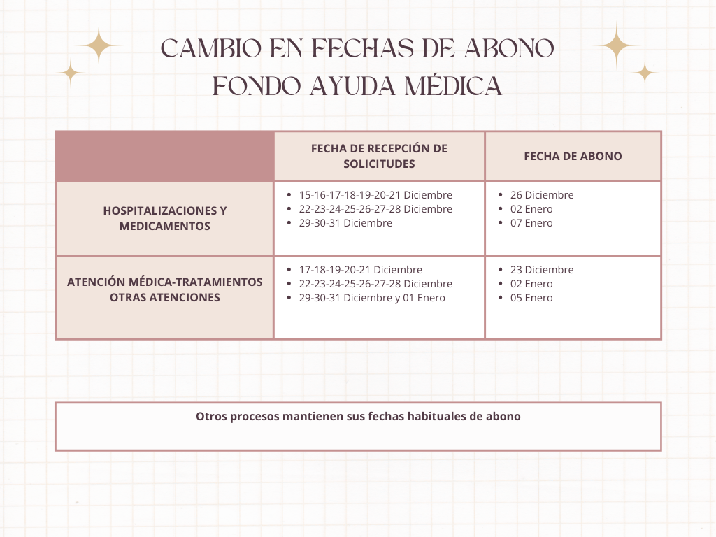 Les informamos cambios en las fechas de abono de Reembolsos Médicos, debido a los feriados de fin de año y actividad interna de la Corporación. Revisa el detalle para planificar tus solicitudes.